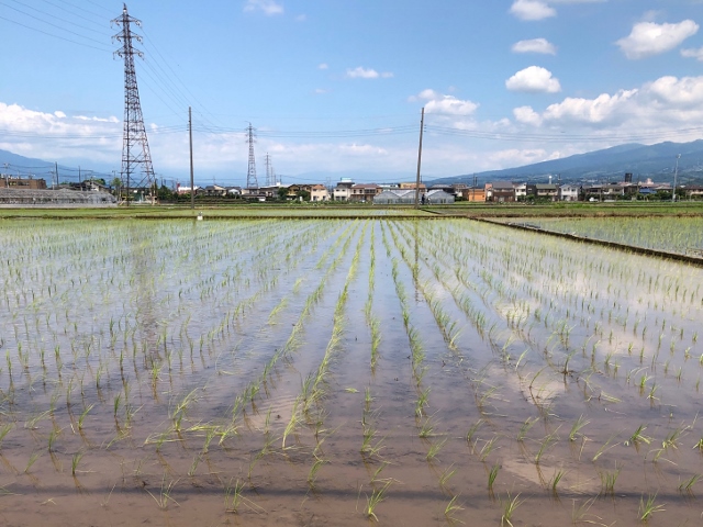 田んぼには、ちびっこの苗がお行儀よく並んでいます。