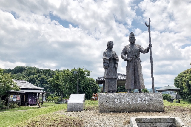 若き頼朝と妻政子をイメージしたブロンズ像があります。