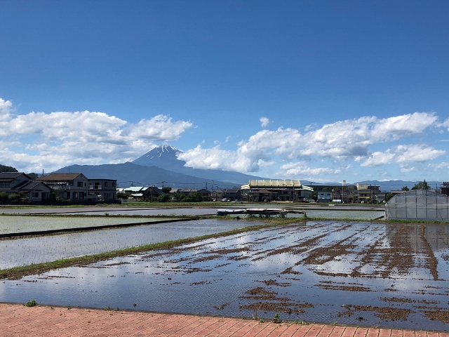 田んぼに映る逆さ富士の姿を見ることができます。